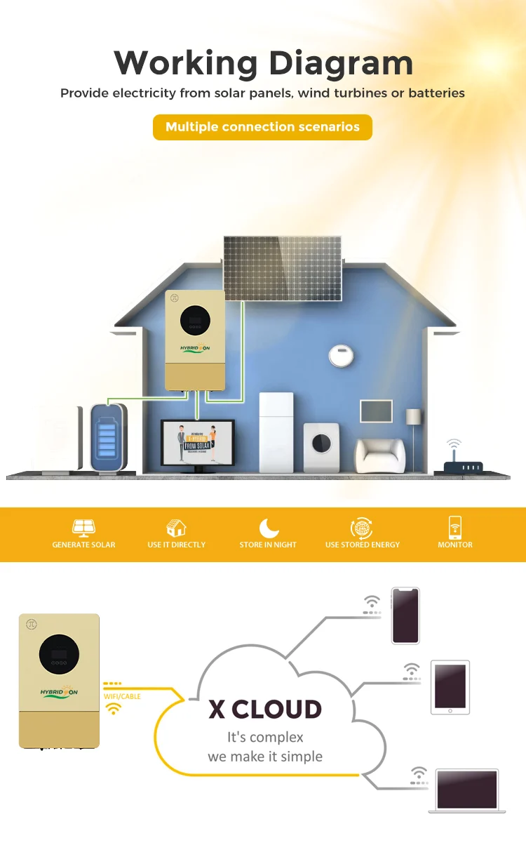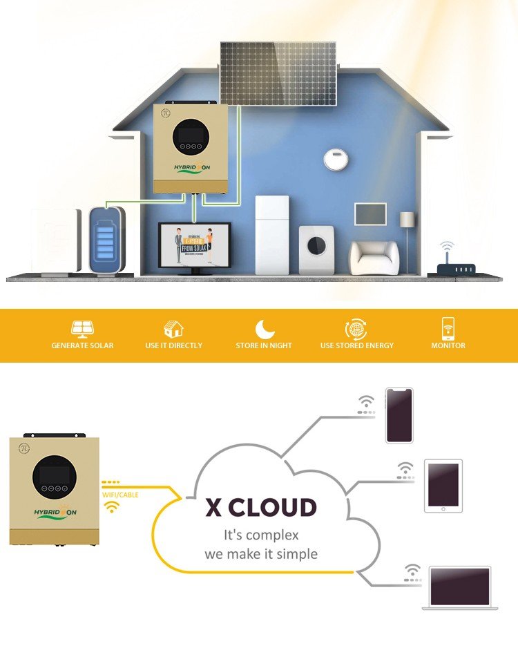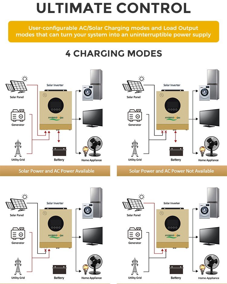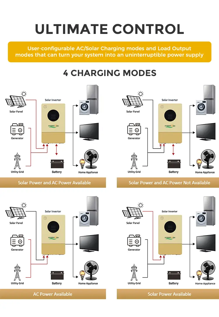 This inverter offers the flexibility of grid-assistance and generator compatibility, allowing smooth power transition during outages. The LCD control panel enables customizable settings such as AC/Solar priority and charging preferences, making it adaptable for various applications.